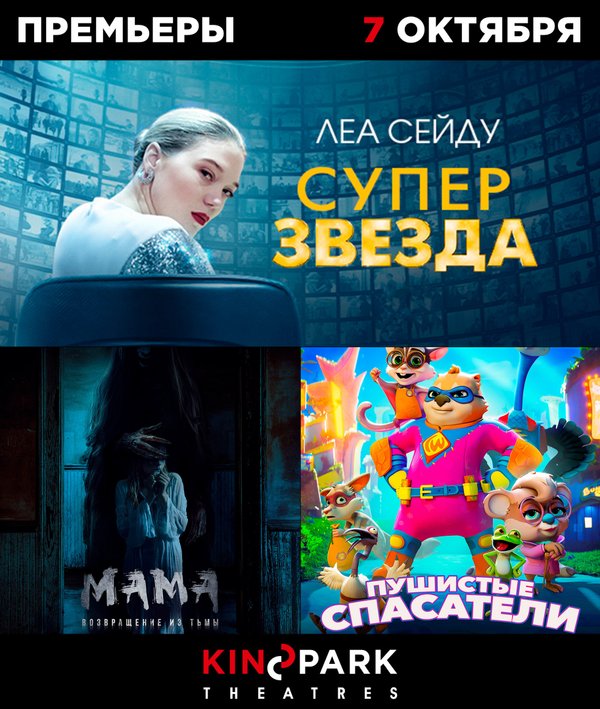 Премьеры 7 октября! Сегодня четверг, и мы рады поделиться с вами подборкой премьер! «Суперзвезда» (Драма, комедия, 16+) «Мама: Возвращение тьмы» (Хоррор, 16+) «Пушистые спасатели» (Мультфильм, семейный, фэнтези, 6+) Выбирайте фильм и удобный сеанс на сайте kinopark.kz, и до встречи в кино!