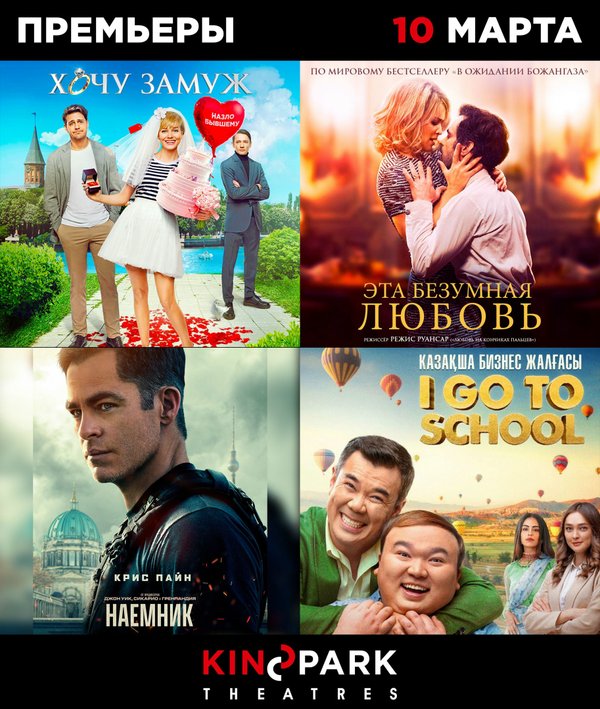 Премьеры в Kinopark! Сегодня 10 марта, и вы представляем вам подборку премьер! Что смотреть с сегодняшнего дня на наших экранах? «Наемник» (боевик, триллер) «Эта безумная любовь» (драма, 16+) «Хочу замуж» (комедия, 12+) «I go to school» (комедия, 12+) Выбирайте фильм, удобный сеанс, и до встречи в кино!