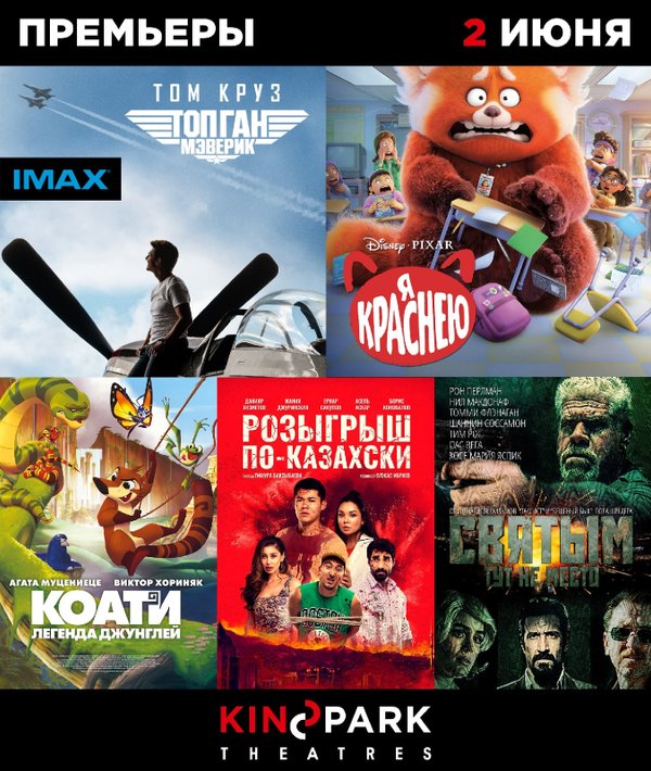 Первая летняя подборка премьер в наших кинотеатрах! 2 июня, и мы с радостью рассказываем, что смотреть с сегодняшнего дня: «Топ Гап: Мэверик», также в формате IMAX (боевик, 16+) «Я краснею» (анимация, 6+) «Розыгрыш по-казахски» (комедия, 12+) «Коати. Легенда джунглей» (мультфильм, 6+) «Святым тут не место» (боевик, 18+) ️Выбирайте фильм и удобный сеанс на kinopark.kz, и до встречи в кино!