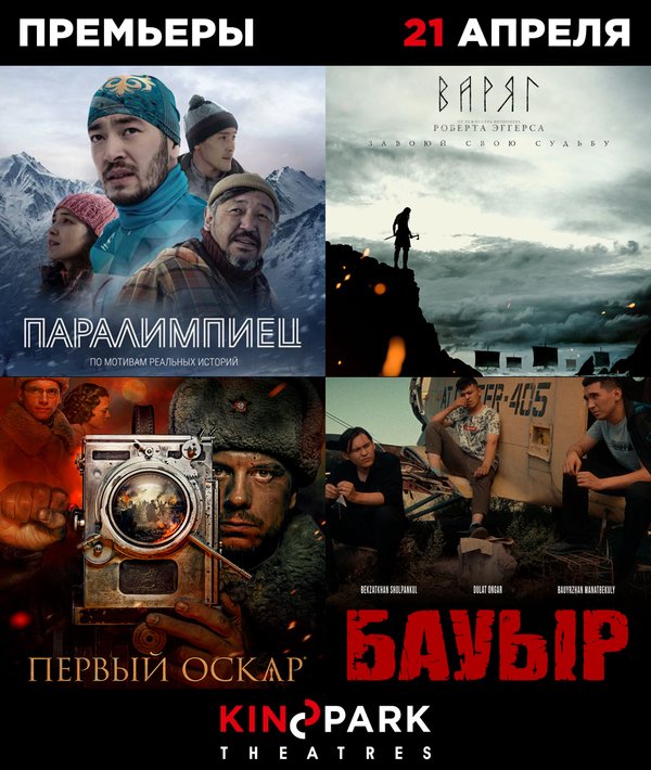 Премьеры в Kinopark 21 апреля, и мы рады поделиться с вами подборкой премьер четверга! Что смотреть с сегодняшнего дня на наших экранах: «Паралимпиец» (спорт, 14+) «Варяг» (триллер, боевик, драма, 16+) «Первый Оскар» (драма, 12+) «Бауыр» (криминальная драма, 16+) «Близнец» (ужасы, 18+) «Братцы Кролики: Пасхальный переполох» «Слэпфейс» (ужасы, триллер, 18+) Выбирайте фильм, удобный сеанс на сайте kinopark.kz, и до встречи в кино!