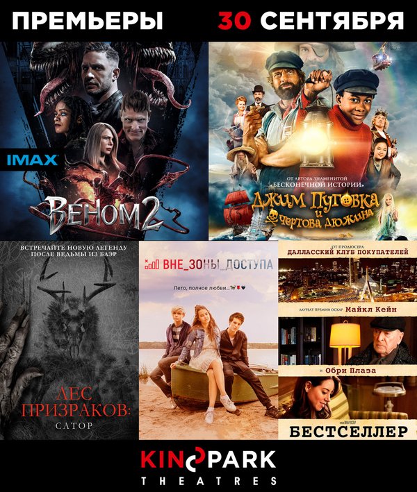 Премьеры в Kinopark! 30 сентября, четверг, и мы рады поделиться подборкой с новыми фильмами! Итак, что смотреть на наших экранах с сегодняшнего дня: «Веном 2», также в формате IMAX 3D (Триллер, ужасы, фантастика, экшн, 16+) «Вне зоны доступа» (Комедия, мелодрама, 6+) «Бестселлер» (Драма, комедия, 18+) «Лес призраков: Сатор» (Хоррор, 18+) «Джим Пуговка и чертова дюжина» (Комедия, фэнтези, 6+) Выбирайте фильм, удобный сеанс на kinopark.kz, и до встречи в кино!