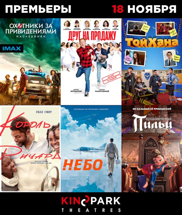 Что смотреть с сегодняшнего дня в Kinopark? На календаре 18 ноября, а это значит, что в наших кинотеатрах новые фильмы! — «Охотники за привидениями: Наследники», также в формате IMAX (Комедия, фантастика, 12+) — «ТойХана» (комедия, 12+) — «Король Ричард» (Биография, драма, спорт, 12+) — «Небо» (Драма, экшн, 12+) — «Приключения Пильи» (Анимация, приключения, фэнтези, 6+) Выбирайте фильм, удобный сеанс на kinopark.kz, и до встречи в кино!