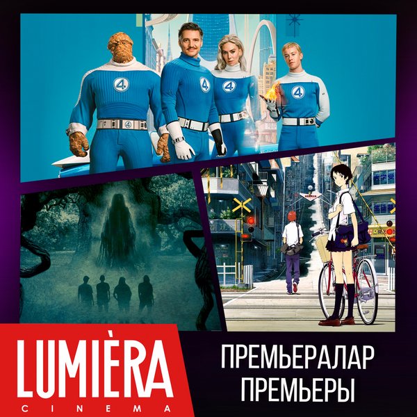 Дәстүр бойынша біз сіздермен бугіннен бастап Lumiera cinema сізді кутетін жаңа фильмдермен белісеміз ___ По традиции делимся с вами новинками кино, которые будут ждать вас в Lumiera cinema уже с сегодняшнего дня «Фантастическая четвёрка: Первые шаги» жанр: боевик, приключения, фантастика 14+ «Девочка, покорившая время» жанр: аниме, драма, мелодрама 12+ «Городские легенды: Парк кошмаров» жанр: ужасы 18+