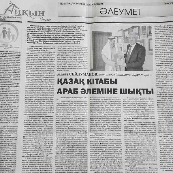 Ұлттық кітапхана басшылығы бүгінде араб əлемімен тығыз қарым-қатынас жасап жатқандығын жеткізгенбіз. Жуырда ғана БАƏ Əбу-Даби қаласында іссапарда болып қайтқан Ұлттық кітапханамыздың директоры Жанат Сейдумановтың «Қазақ кітабы Араб əлеміне шықты» деген сұқбаты «Айқын» газетінің #75 санында жарық көрді. Қазақстан Республикасы Ұлттық Кітапхана