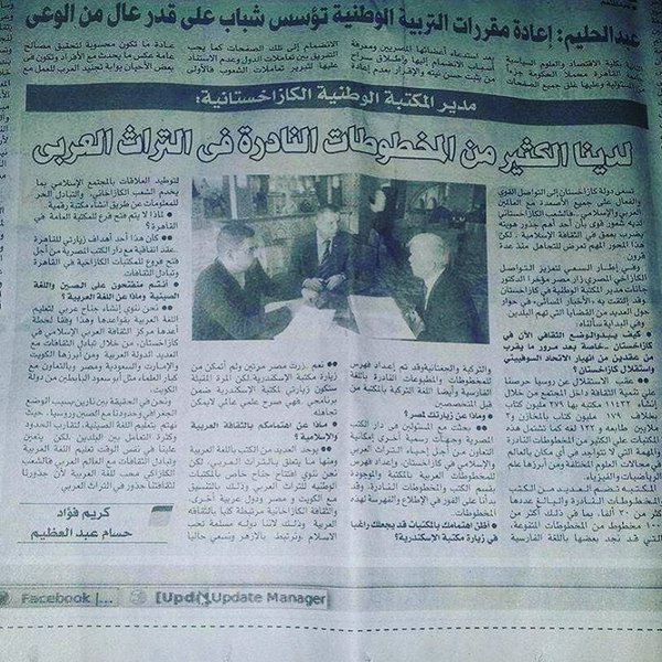 ّالاخبار المسائي «ал-Ахбар ал-Масаии» деген газетте @ulttykkitapkhana директоры Ж.Т. Сейдуманов Қазақстанның бүгінгі жəне болашақтағы кітапханаларының даму стратегиясы, олардың жан-жақтылығы жөнінде берге сұқбаты жарияланды. Алматы Национальная Библиотека