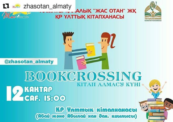 zhasotan_almaty with @repostapp Құрметті, Алматы қаласының жалынды жастары! 12-қаңтар сағат 15:00-де «ҚР Ұлттық кітапxанасы» мен «Жас Отан» Жастар қанатының Алматы қалалық филиалының ұйымдастыруымен кітап ауыстыруға арналған «Буккроссинг» жобасы өткізіледі. Кітап алмасып, руxани танымымызды арттырайық! Кітап алмасайық! Алматы Национальная Библиотека