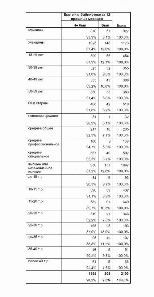 Немного запоздало отвечаю тем, кто думает, что в библиотеки ходят представители особой субкультуры, странной и загадочной, и на основании их вкусов нельзя сделать никаких выводов о вкусах всех остальны читателей. В приложении несколько таблиц со сравнениями посетителей и не-посетителей петербургской городской сети библиотек по стандартным демографическим параметрам и по литературным вкусам (опрос описан в статье в ЭкСоц). Как видно из них, отличия есть, но они ровно те же, которые отличают людей, вообще читающих художественную литературу, от… — Читать дальше