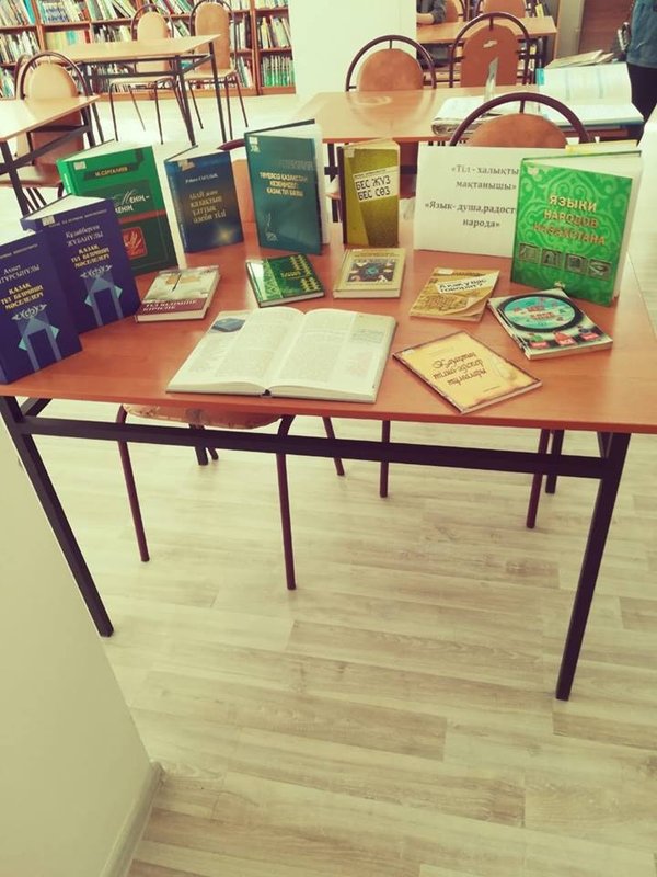 рассказали об истории письменности казахского языка, применения арабской вязи, латиницы и кириллицы в государственном языке РК. В конце мероприятия был проведен просмотр книг «Тіл – татулық тірегі», на которой были представлены книги по грамматике казахского языка, культуре речи, словари, а так же книги о казахских обрядах, пословицах и поговорках.