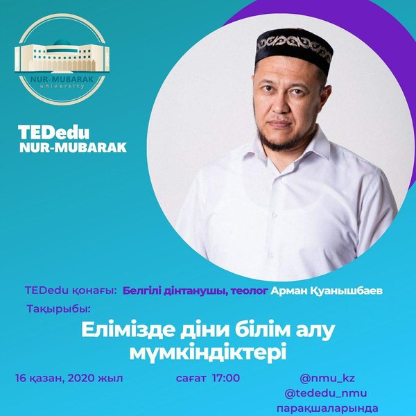 Нұр-Мүбарак университетіндегі @tededu_nmu ұйымдастыруымен 16 қазан күні сағат 17:00-де белгілі дінтанушы, теолог @armanustaz.kz «Еліміздегі діни білімді алу мүмкіндіктері» тақырыбында онлайн сұхбатқа шығады. Тікелей эфирді @nmu_kz және @tededu_nmu парақшаларынан көре аласыздар.