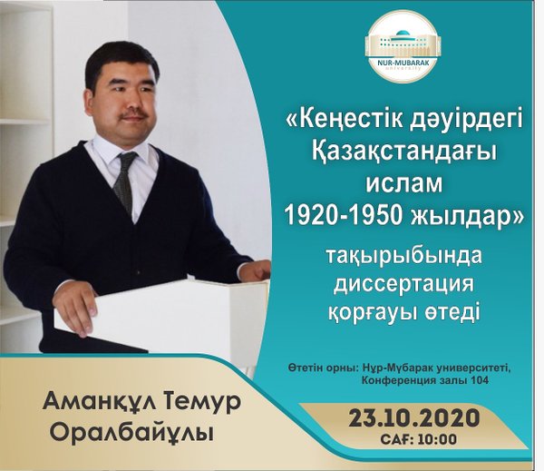 Бүгін 6D020600– Дінтану мамандығы бойынша философия докторы (PhD) ғылыми дәрежесін алу үшін дайындаған Аманқұл Темур Оралбайұлының «Кеңестік дәуірдегі Қазақстандағы ислам 1920—1950 жылдар» тақырыбындағы диссертациясының қорғауы өтеді. Уақыты: сағат 10:00. Өтетін жері: Нұр-Мүбарак Египет ислам мәдениеті университеті, әл-Фараби даңғ., 73, Конференция залы 104.