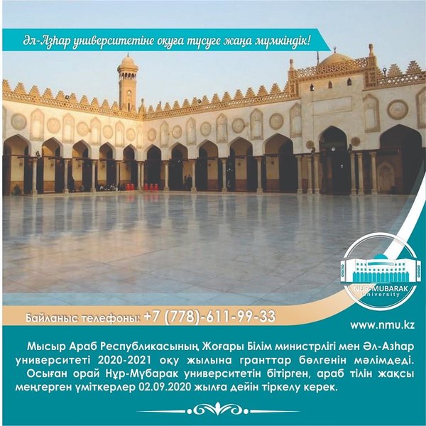 Әл-Азһар университетіне оқуға түсуге жаңа мүмкіндік! Мысыр Араб Республикасының Жоғары Білім министрлігі мен Әл-Азһар университеті 2020—2021 оқу жылына гранттар бөлгенін мәлімдеді. Осыған орай Нұр-Мүбарак университетін бітірген, араб тілін жақсы меңгерген үміткерлер 04.09.2020 жылға дейін тіркелу керек. Байланыс телефоны:.