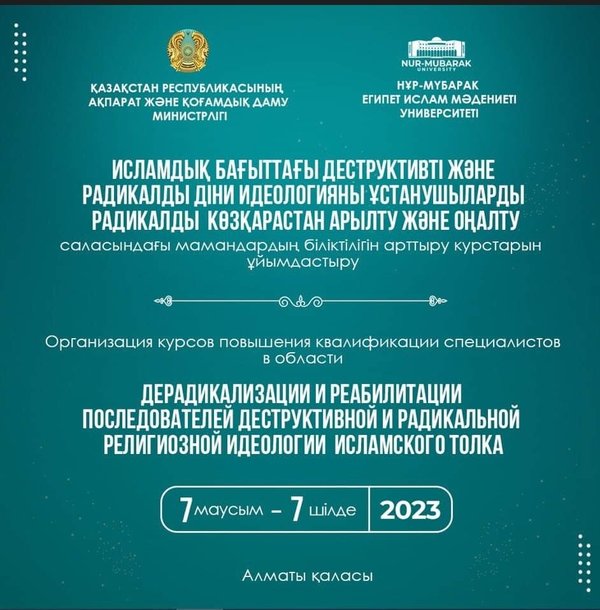ы. 140 академиялық сағатқа есептелген курста 15 пән оқытылады. Курс тыңдаушылары еліміздің 17 аймағындағы діни салада қызмет атқаратын мамандар, атап айтқанда имамдар, теологтар және басқа да мамандар болып табылады. Өз әдістемесі бойынша курс академиялық тәсілмен және дерадикализация әдістерінің академиялық мәселелерін, мақсатты топтармен (радикалдармен) атаулы түсіндіру жұмысын ұйымдастыруды және деструктивті радикалды ағымдардың ізбасарларымен жұмыс істеу құралдарын қамтитын өзекті дәрістік бағдарламамен ерекшеленеді. Дәрістерді еліміздегі жоғарғы исламдық білім беретін Нұр-Мүбарак ЕИМУ-дың білікті оқытушылары, сондай-ақ Ұлттық қоғамдық сенім кеңесі, Ұлттық қауіпсіздік комитеті академиясы мен республиканың жетекші оқу орындарының осы саладағы арнайы шақырылған танымал білікті мамандары жүргізуде. ПРЕСС РЕЛИЗ Комитетом по делам религий Министерства информации и общественного развития РК совместно с Египетским университетом исламской культуры Нур-Мубарак (далее – ЕУИК Нур-Мубарак) в июне-июле 2021 года проводится курс «Повышение квалификации специалистов в области дерадикализации и реабилитации последователей деструктивной и радикальной религиозной идеологии исламского толка». Организатором курса является Центр противодействия религиозному экстремизму при ЕУИК Нур-Мубарак с 2016 года. Курс состоит из 15 дисциплин и рассчитан на 140 академических часов. Слушателями являются специалисты, непосредственно занятые в религиозной сфере, именно имамы, теологи и другие специалисты из 17 регионов страны. По своей методике курс отличается академическим подходом и актуальной лекционной программой, включающей в себя академические вопросы методов дерадикализации, организации адресной разъяснительной работы с целевыми группами (радикалами) и инструменты по работе с последователями деструктивных радикальных течении. Обучение будут проводить высококвалифицированные преподаватели ЕУИК Нур-Мубарак, университета высшего исламского образования в стране, а также приглашенные опытные специалисты, известные в этой области из: Национального совета общественного доверия (НСОД), Академии КНБ и ведущих учебных заведений РК.