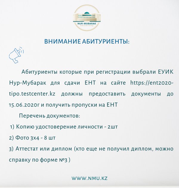 рапиялық диспансерден анықтама және сотталмағандығы туралы куәлік талап етіледі. Ескерту! Бұл хабарландыру, тек ent2020-tipo.testcenter.kz сайтына өтініш білдіру кезінде ҰБТ-ді Нұр-Мүбарак ЕИМУ арқылы тапсырамыз деп өтініш білдіргендер үшін! Дорогие абитуриенты, пропуски готовы! Перечень документов, необходимых для получения пропусков! 1) Заявление пишите у нас 2) Аттестат или диплом(оригинал) 3) Фото 3х4 8 штук 4) Медицинская справка 086-У(обязательно-фото абитуриента на справке и печать медицинской организации на фото абитуриента, флюрографический снимок) 5) Прививочная карта 063 6) Копия удостоверения личности 2 шт 7) Справка о не судимости, справка от психо, нарко диспансера Внимание! Это касается только для абитуриентов которые подовали заявление для участия в ЕНТ через ent2020-tipo.testcenter.kz и указывали в пунтке место сдачи ЕНТ ЕУИК Нур-Мубарак