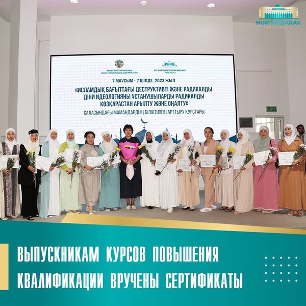 игий Министерства культуры и информации Республики Казахстан Е. Нүкежанова и проректора университета Нур-Мубарак, PhD доктора К. Курманбаева. Курс под названием «Организация курсов повышения квалификации специалистов в области дерадикализации и реабилитации сторонников деструктивной и радикальной религиозной идеологии исламского толка» успешно проводится уже пятый год, так как демонстрирует значительные положительные результаты в повышении квалификации отечественных религиозных работников. Курс включает актуальную лекционную программу и академический подход, организующий целевую работу с группами (радикалами) и инструменты работы с последователями деструктивных радикальных течений в стране. На курсе выступали ученые и высококвалифицированные специалисты ведущих учебных заведений страны, в том числе ЕУИМ Нұр-Мүбарак, Академии национальной безопасности РК, Института дипломатии Академии государственного управления при Президенте РК, эксперты Республиканской информационно-разъяснительной группы при Министерстве культуры и информации РК. Для контроля и оценки знаний слушателей проводились тесты по темам: «Первые признаки радикализации и методы предотвращения: проблематика понимания религиозных текстов», «Теология и философия: их взаимоотношения в современном мире», «Социология религии и особенности современной религиозности», «Конфликтология и медиация в процессе конфликта», «Риск радикализации в ханафитских общинах и факторы». Результаты тестов позволили определить уровни квалификации специалистов. С 2020 года на ежегодно проходящем курсе обучались около 400 религиозных работников. В ходе курса каждый год проводятся опросы, и специалисты открыто выражают свои мнения, предложения и благодарности. Учитывая результаты анализа эффективности курса, его проведение будет продолжено и в будущем.