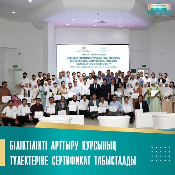ахстана. Первый курс организован 2020 году. В течение месяца теологи, исламоведы, религиоведы, имамы прошли 15 дисциплин, которые преподавали высококвалифицированные ведущие специалисты из университета Нур-Мубарак, ЕНУ им. Гумилева, ДУМК, Академии КНБ РК. «Государство – наш общий дом. Территориальная целостность нашего государства, стабильная религиозная ситуация, формирование мирного общества – задача каждого гражданина. Мы все заинтересованы в светлом будущем страны и безопасности нашего общества. Но в современном мире немало вызовов и угроз, в том числе со стороны различных террористических и экстремистских организаций, которые умело используют религию в своих неблаговидных целях. Поэтому мы должны делать все, чтобы сохранить у себя стабильную религиозную ситуацию и способствовать тем самым укреплению мира на нашей земле», – отметил проректор, доктор PhD Кайрат Курманбев. Слушателям курса вручены сертификаты и благодарственные письма. Пресс-служба университета Нур-Мубарак