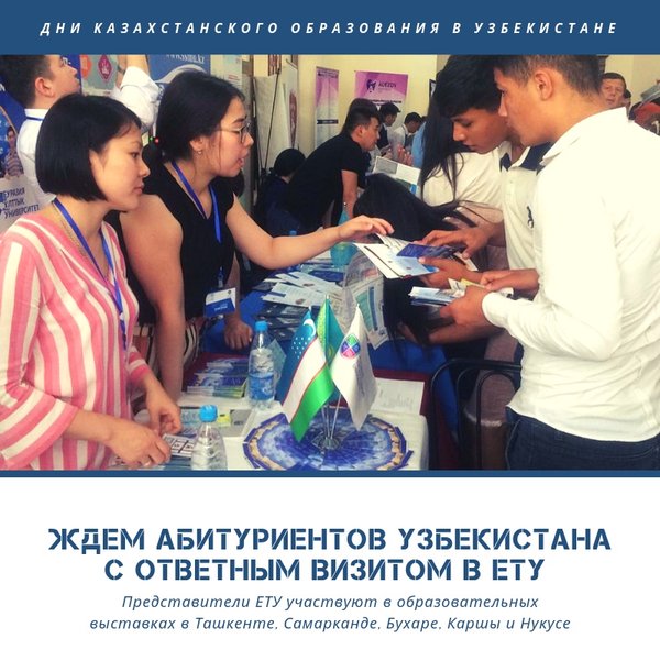 баевич; Начальник секретариата по вопросам связей с общественными организациями Сейтимбетов Алишер Алланиязович; Представитель ЕТУ в Республике Узбекистан Садирбаева Клара Кундибаевна. Летом 2019 года ЕТУ вёл активную политику по привлечению студентов из Узбекистана. В нескольких городах соседней страны были установлены консультационные центры, также принимающие документы на обучение в Евразийском технологическом университете. ЕТУ в рамках года Казахстана в Узбекистане способствует развитию отношений двух дружественных стран в области образования и науки!