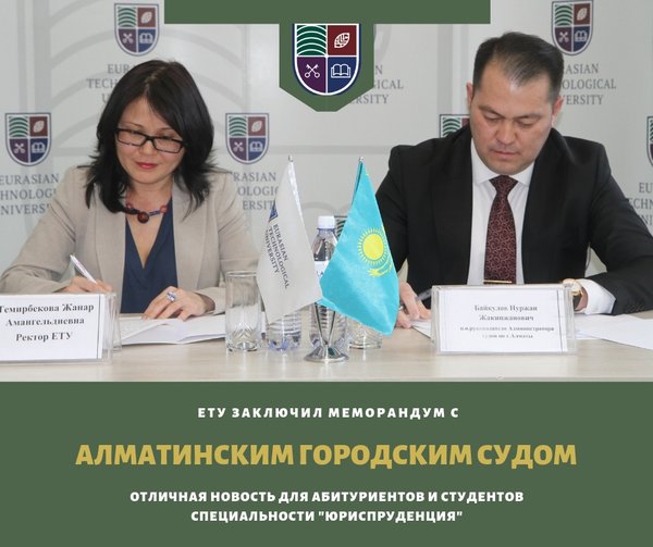 24 мая ректор ЕТУ Темирбекова Жанар Амангельдыевна и И.о. руководителя Администрации судов по городу Алматы подписали все необходимые документы по сотрудничеству, которое положительно скажется, в первую очередь для студентов специальности «Юриспруденция».