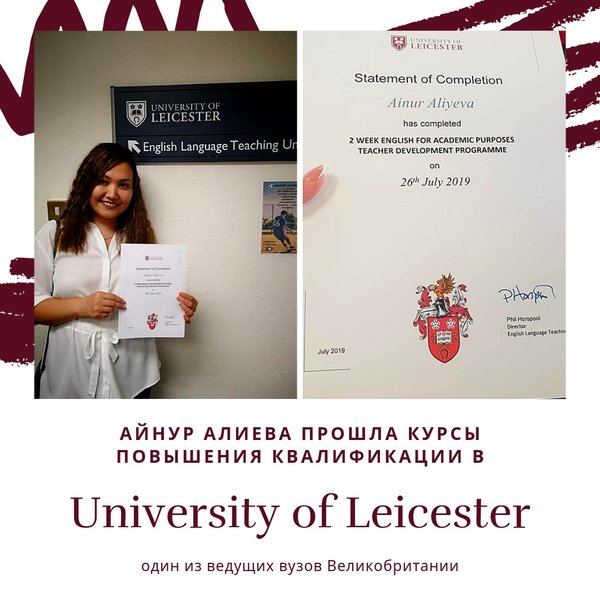 тодики, помогающие заинтересовать детей учить английский язык. Также в июле Айнур Алиева выиграла внутренний конкурс ЕТУ на прохождения курса повышения квалификации для преподавателей английского языка в Университете Лестера (Великобритания). За полученные необходимые навыки и компетенции и отличную защиту тестов нашему преподавателю был вручён сертификат об успешном завершении курса! Facebook Айнур Алиевой: «Выражаю огромную благодарность Международному департаменту Евразийского Технологического университета за предоставленную возможность! Это был бесценный опыт для меня, которым я спешу поделиться со своими студентами в новом учебном году »