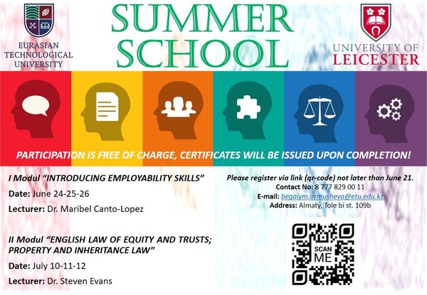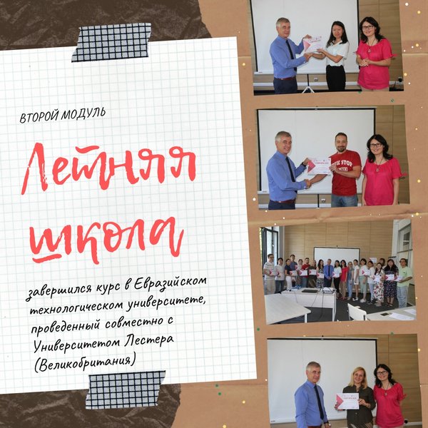 ительные впечатления, что участникам грустно было оставлять ту атмосферу, которая сложилась за эти три дня. Главным завершением модуля стало вручение сертификатов участникам Летней школы. Первый модуль остался позади и судя по огромную желанию ее участников, они с нетерпением ожидают второго. Летняя школа «Introducing Employability skills» собрала самых разных представителей. Курс прошли студенты и магистранты ЕТУ и других вузов, преподавателей университетов, сложившихся профессионалов юридической и экономической отрасли страны. Выражаем благодарность Евразийскому технологическому университету и Университету Лестеру за предоставленный шанс всем желающим быть частью прекрасной программы!