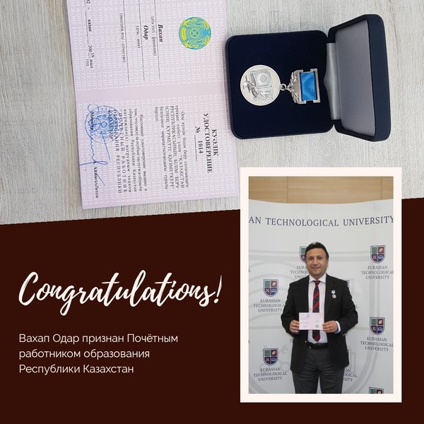 Директор Департамента по молодёжной политике ЕТУ Вахап Одар получил награду «Почетный работник образования Республики Казахстан». Весь состав университета выражает огромную благодарность Вахап бею за его профессионализм и вклад в развитие Евразийского технологического университета! Давайте дружно поздравим господина Одара в комментариях!