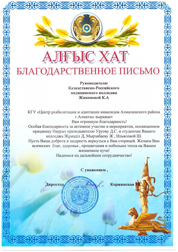 лледждерімен студенттік алмасуын өткізбекпіз. 5.Оқу соңында жұмысқа орналыстыру. Өткізген анализдер қорытындысы бойынша біздің студенттердің көпшілігі сәтті жұмыс орындарына орналасады. 6.Теоретиялық білімін тәжірибиімен бекітіледі. 7.Әрбір студентке дара тіл табу. Біздің оқытушылар құрамымен студенттік үйірмелер қарастырылған. Онда әрбір студент бос уақытында келе жатқан іс-шараларға дайындық өткізе алады. 8.Қазақстанда ғана емес, жақын шетелдегі семинарларға, ғылыми-практикаларға қатысуы. 9.Белсенді студенттік өмір. Оқу орнымызда әр-түрлі іс-шаралар өткізіледі. 10.Оқуға деген үлкен талпыныс. Ең бастысы, Қазақстан-Ресей медициналық колледжі — үлкен бір отбасы. Жоғарыда айтылған бәрі, сіздің өмірінізде болғанын қаласаңыз бірден бізді таңдаңыз. Сізге емтиxаныңызды сәтті аяқтауға тілектеспіз!