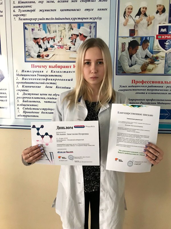 ся, как поступления, так сдачи сессий и государственных экзаменов. 3.Оснащенная материально-техническая база колледжа. 4.Сотрудничество с крупнейшими медицинскими колледжами Российской Федерации, проведение совместных семинаров, курсов. В ближайшем будущем мы намерены осуществлять обмен студентами в ведущие колледжи России. 5. Успешное трудоустройство по окончании нашего учебного заведения. Согласно анализу собранных данных, весомая часть студентов Казахстанско-Российского медицинского колледжа с успехом трудоустраиваются на желаемые места работы, остальные – продолжают учебу в прогрессивных медицинских университетах нашей страны. Такие, казалось бы, ошеломляющие результаты достигаются нами благодаря ежегодной ярмарке вакансий, активно практикующейся в стенах нашего учебного заведения. 6. Закрепление всех теоретических знаний на практических занятиях, проводимых, как внутри нашего колледжа, так и за его пределами. 7.Индивидуальный подход к каждому из наших подопечных. Наши грамотные, во всех смыслах этого слова, специалисты очень трепетно относятся к интересам своих учащихся, а также прикладывают максимум усилий для того, чтобы направить каждого студента в нужное русло, где бы он смог раскрыться абсолютно по-новому не только для себя, но и для своих сокурсников. Так нашим инициативным преподавательским составом ежегодно разрабатываются различные студенческие кружки, где в свободное от занятий время студенты могут прогнать очередную пьесу, либо подготовиться к решающему турниру по футболу. 8.Участие в семинарах, научно-практических конференциях, как в Казахстане, так и в странах ближнего зарубежья. 9.Активная студенческая жизнь. Несмотря на всю серьезность и ответственность получаемых знаний будущими светилами отечественной медицины, в нашем колледже постоянно проводятся различного рода мероприятия: посвящение в студенты, олимпиады, зажигательные концерты, увлекательные конкурсы, активная работа в Студенческом совете и многое другое. 10.Неустанное желание приходить на занятия и пребывать в стенах нашего медицинского колледжа. Казахстанско-Российский медицинский колледж — это, в первую очередь, одна большая семья, где каждый заинтересован в успехах, личностном росте и пока небольших, но победах друг друга. Сплочённость, взаимовыручка, уважение и понимание — те качества, которые присущи, как нашим студентам, так и всему преподавательскому составу, благодаря которым мы с каждым днём становимся все ближе к новым вершинам и пьедесталам. Если вы хотите, чтобы все перечисленное имело место быть и в вашей жизни, то, ни минуты не колеблясь, выбирайте нас, Казахстанско-Российский медицинский колледж. Желаем успешной сдачи экзаменов и вступления в интересную, яркую и незабываемую пору студенчества!