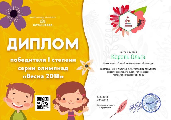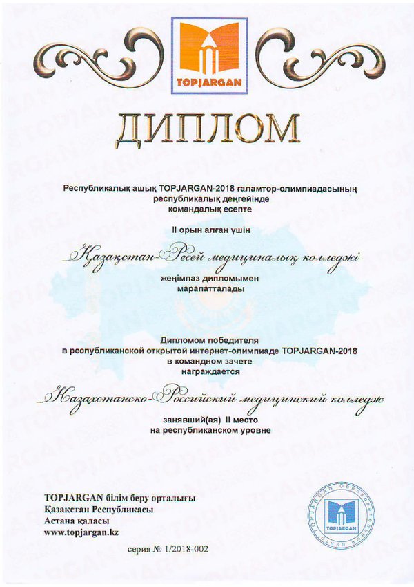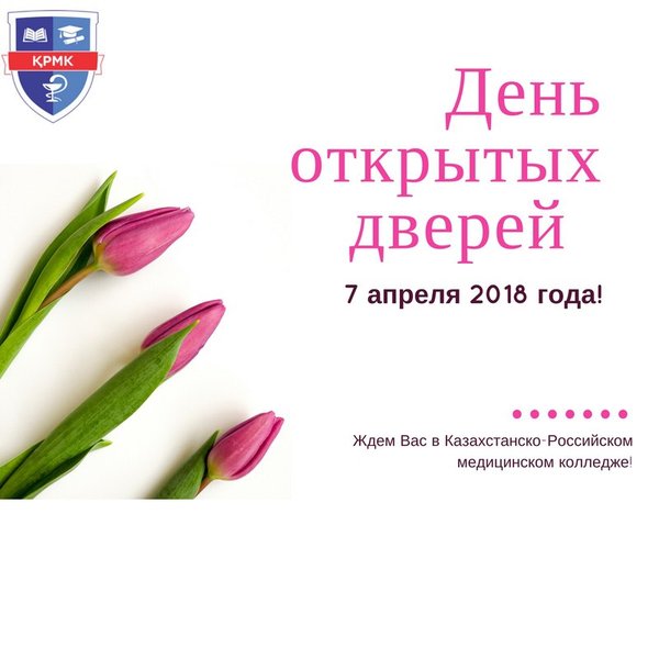 Бірінші бөлімі (тестілеу) – 7 сәуір 2018 ж. Екінші бөлімі (әрбір пән бойынша бақылау жұмыстарын орындау) – 13 сәуір 2018 ж. Программа Дня открытых дверей: 1. Знакомство с Казахстанско-Российским медицинским колледжем 2. Концерт для участников, подготовленный силами студентов КРМК 3. Предметная Олимпиада среди школьников 9-х классов Цель Олимпиады – отбор пяти победителей, которые получат Грант на первый год обучения в колледже по избранной специальности от Ректора Казахстанско-Российского медицинского университета. Олимпиада проводится по 4 дисциплинам: 1. Химия 2. Биология 3. Математика 4. Английский язык Олимпиада будет проходить в два этапа: Первый этап (тестирование) – 7 апреля 2018 г. Второй этап (выполнение контрольного задания по каждой дисциплине) – 13 апреля 2018 г. Будем рады видеть Вас в стенах нашего колледжа!