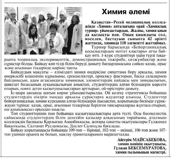 В рамках недели естественно- математического направления, в колледже прошёл “Химический турнир» на трёх языках, между казахскими и русскими группами. Конкурс состоял из четырёх туров: представление команды, кроссворд, химический эксперимент и вопросы. В результате конкурса 1 место получила 109 группа, 2 место 102 и 3 место 106 и 107 группы.