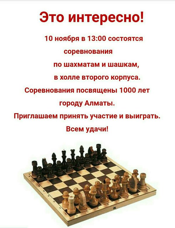 Уважаемые студенты колледжа 1,2,3 курсы Завтра, 17 октября, состоится соревнования по шахматам и шашкам В холле второго корпусса в час дня Всех желающих прошу написать в коментарии » » Победители будут вознагражденны!