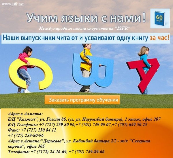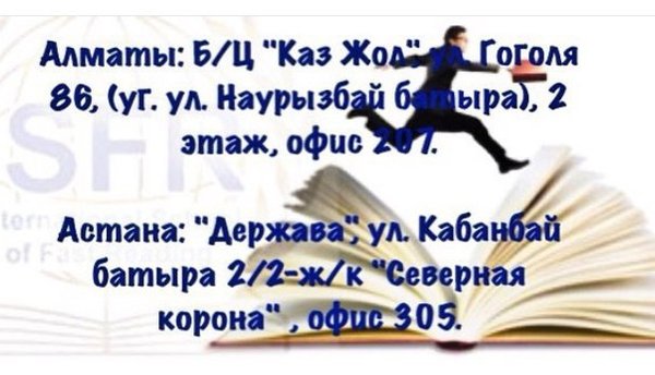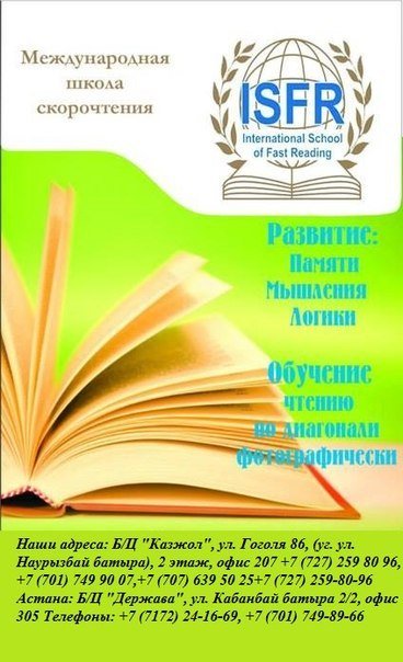 Читайте с пользой для себя. Высокая скорость чтения, отличная память, развитие необходимых навыков для успешного будущего! Адрес в Алматы: Б/Ц «Казжол», ул. Гоголя 86, (уг. ул. Наурызбай батыра), 2 этаж, офис 207 Б/Ц Телефоны:,, Адрес в Астане:«Держава», ул. Кабанбай батыра 2/2 - ж/к «Северная корона», офис 305 Телефоны:,