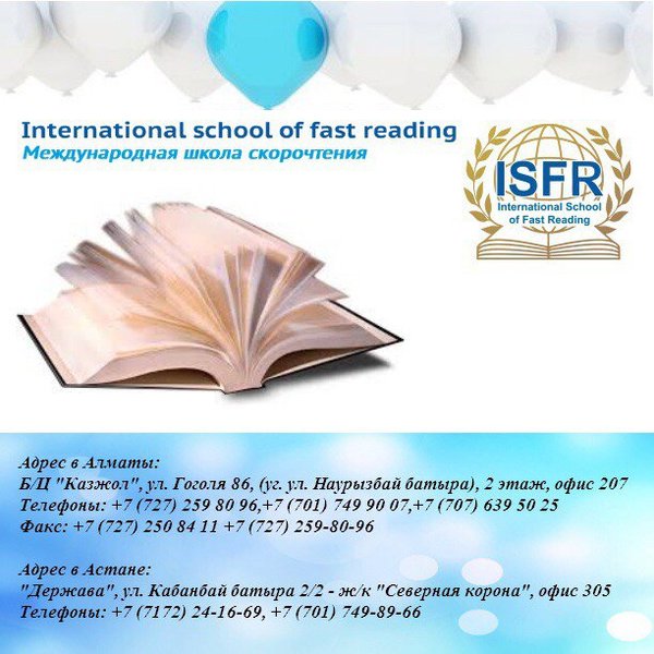«International school of fast reading» Международная Школа Скорочтения Алматы: Б/Ц «Каз Жол», ул. Гоголя 86, (уг. ул. Наурызбай батыра), 2 этаж, офис 207. Астана: «Держава», ул. Кабанбай батыра 2/2-ж/к «Северная корона», офис 305.