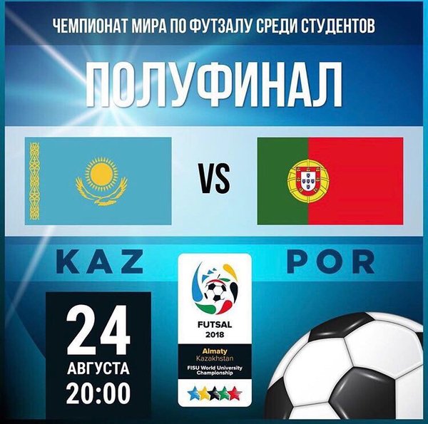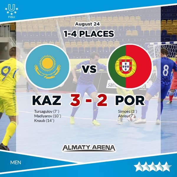 ына 11-нөмерлі Агедиль Мадияров пен 10-нөмерлі Арнольд Кнауб салды. Тартысты матч 3:2 есебімен аяқталды. Қазақстан құрамасы финалға шықты. Алдыңғы ойыннан күтеріміз көп! ⠀ В полуфинале Казахстанская сборная по футзалу встретилась со сборной Португалии. С первых минут игра заинтересовала всех болельщиков. Игрок сборной Португалии забил в ворота Казахстана на первых же минутах. Не успели наши противники обрадоваться, как Даурен Турсагулов игрок под номером 12 сравнил счёт. Следующий гол забил Агедиль Мадияров игрок казахстанской сборной под номером 11. ⠀ Но и тут игрок сборной Португалии сравнял счет. На табло 2:2! Чей же гол станет решающим? Арнольд Кнауб игрок сборной Казахстана под номером 10 забивает тот самый долгожданный гол и приносит победу своей сборной. Итак, напряженная игра закончилась со счётом 3:2 в пользу сборной Казахстана тем самым выйдя в финал. Желаем удачи, побольше красивых голов и ярких моментов! Ну и конечно же победы! Алға Қазақстан! ——————————————————— #⠀nslkz