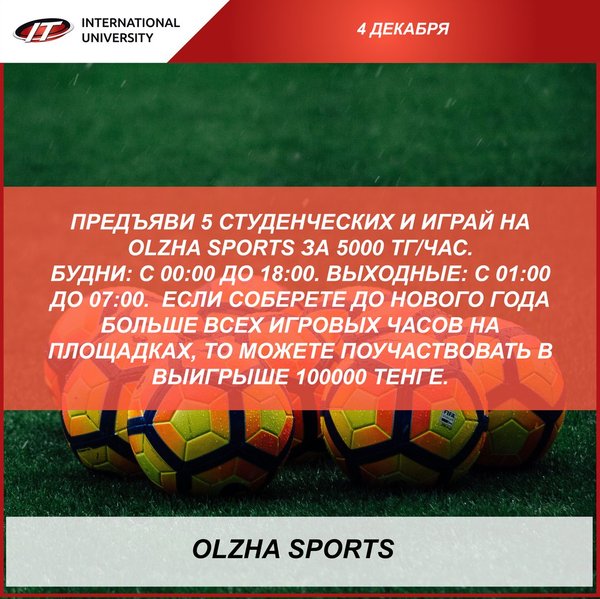 Дорогие друзья Как вы знаете, OlZHA SPORTS друзья и верные партнеры нашего университета ⠀ Мы доверяем любимому футбольному полю и уже много лет место футбольных встреч не изменно. OLZHA SPOTRS ценит наше доверие и объявляет целых две акции для студентов МУИТ! У вас есть шанс выиграть 100000 тенге! ⠀ 1⃣ При предъявлении 5 студенческих билетов до конца учебного года, получаете скидку — 5000 тг/час ⠀ 2⃣ Если соберете до нового года больше всех игровых часов на площадках, то можете поучаствовать в выигрыше 100000 тенге. ⠀ Если ты любишь ф… — Читать дальше
