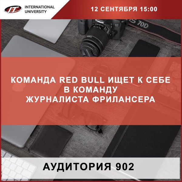 ю анкету о себе и свою работу на адрес Yuliya.Antonova@redbull.com Где искать вдохновение? На redbull.kz! Где искать визуальное сопровождение? На redbullcontentpool.com Даты проведения конкурса: с 10 сентября по 30 сентября 2018 года. Остались вопросы? Задай их на встрече с представителем Red Bull – менеджером по коммуникациям Юлией Антоновой. Приходи 12 сентября в 15:00 в 902 аудиторию! Удачи!