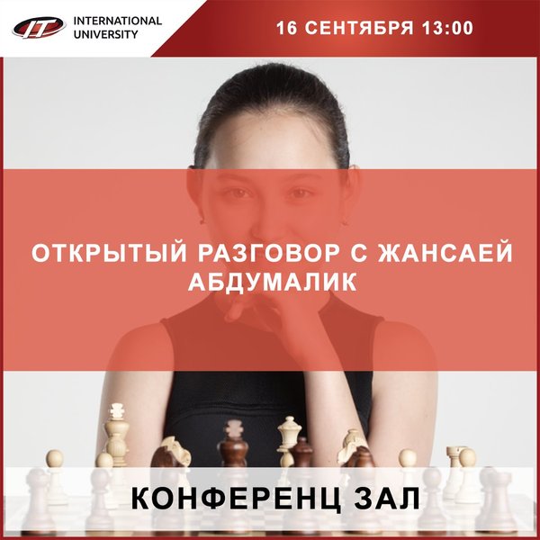 Уже в это воскресенье в стенах нашего университета пройдет интереснейшая встреча с чемпионкой мира по шахматам среди женщин до 20 лет Жансаей Абдумалик! На своем примере она расскажет как же важны родительские советы. Также чемпионка мира поделится с нами про то, как шахматы влияют на развитие, где можно получить качественное шахматное образование и про свои секреты успеха. Где: Конференц зал ⌛ Когда: 16 сентября в 13:00 ⠀⠀⠀ Вход СВОБОДНЫЙ, но необходима предварительная регистрация. Ссылка на регистрацию в био:)