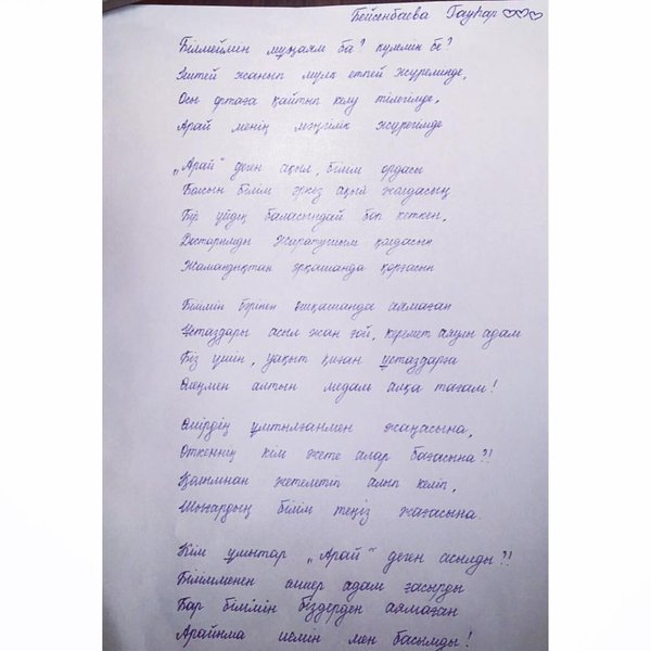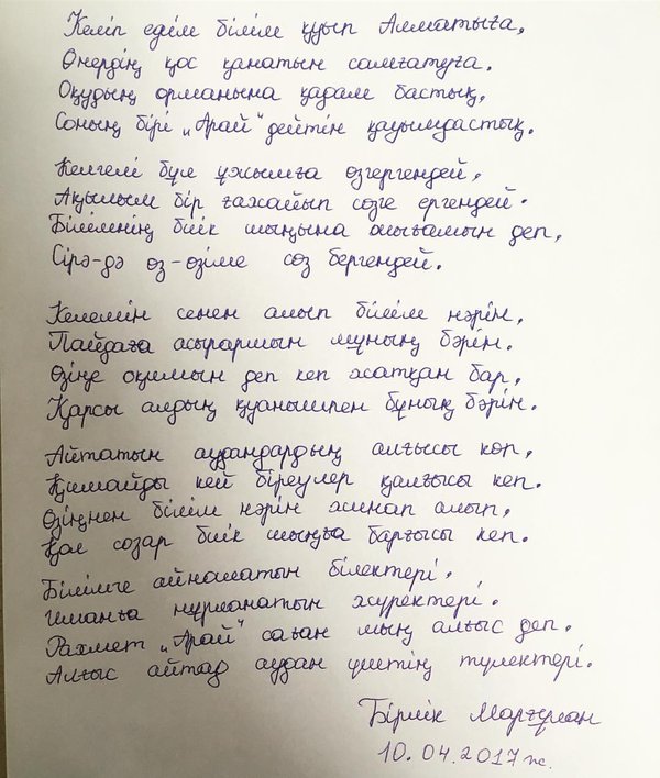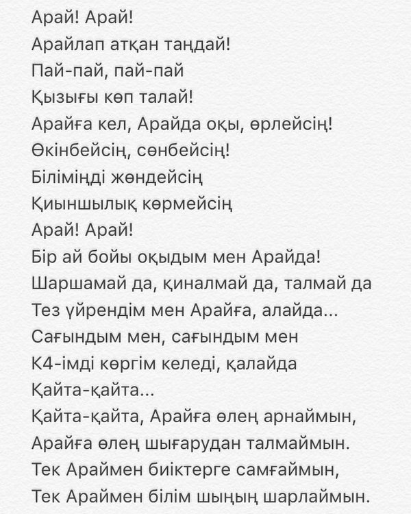 Арай! Арай! Арайлап атқан таңдай! Пай-пай, пай-пай Қызығы көп талай! Арайға кел, Арайда оқы, өрлейсің! Өкінбейсің, сөнбейсің! Біліміңді жөндейсің Қиыншылық көрмейсің Арай! Арай! Бір ай бойы оқыдым мен Арайда! Шаршамай да, қиналмай да, талмай да Тез үйрендім мен Арайға, алайда… Сағындым мен, сағындым мен К4-імді көргім келеді, қалайда Қайта-қайта… Қайта-қайта, Арайға өлең арнаймын, Арайға өлең шығарудан талмаймын. Тек Араймен биіктерге самғаймын, Тек Араймен білім шыңың шарлаймын. Сейтова Диана