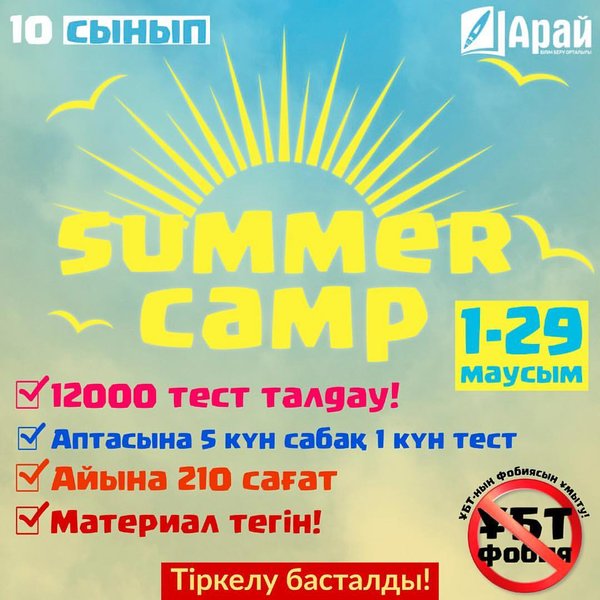 10-сынып оқушыларын жазғы лагерьге шақырамыз!!! P.S.10-сынып достарыңды белгілеуді ұмытпа!!! Арай Тест» Білім Беру Орталығы