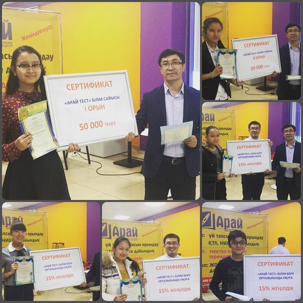 Қазақстан Республикасы тәуелсіздігінің 25 жылдығына орай өткізілген «Арай тест білім сайысы» өз мәресіне жетті. Жүзден жүйрік шығып, үш кезеңді еркін еңсеріп,жеңімпаз атанған оқушыларымызды құттықтаймыз. I орын: Жаңа Ғасыр 175 гимназия оқушысы Болатова Мадина. II орын: 117 мектеп оқушысы Зулмуратова Рамина. III орын: 176 мектеп-гимназиясының оқушысы Болатов Бекзат. Арай Тест» Білім Беру Орталығы