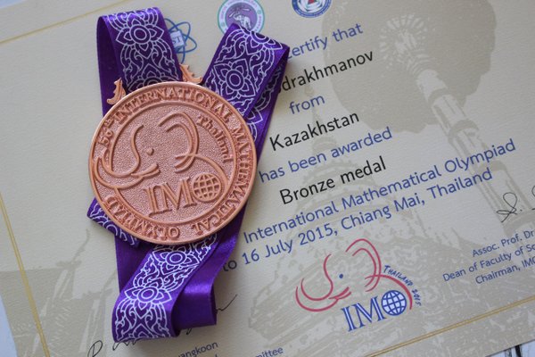 олимпиады Шелковый путь Бронзовый призер Международной математической олимпиады (IMO) Бронзовый призер Балканской олимпиады Бронзовый призер Азиатской Тихоокеанской олимпиады Победитель Турнира городов Член сборной Республики Казахстан по математике Учился в ТЛ № 165 и НАО РФМШ