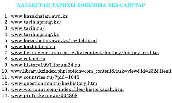 рек өзенінің жағасындағы шешуші шайқас уақыты: D) 1395 ж 7. Әмір Темір жорықтарының Қазақ жеріне тигізген әсері: С) Экономикасының, мәдениетінің дамуына адам айтқысыз зардабын тигізді 8. Ноғай Ордасының орталығы Сарайшық қаласының іргесі қаланған уақыт: В) X ғ. 9. 1580 ж. Сарайшық қаласының біржола қирау себебі: А) Дон, Еділ қазақтарының Жайық бойына шапқыншылық жасау салдарынан 10. Ноғай Ордасында Едігенің билік құрған уақыты: D) 1396—1411 жж 11. Ноғай Ордасының ыдырай бастау уақыты: D) XVI ғ. 12. Қазақ ханы Жәнібек тұсында достық қатынаста өмір сүрген ноғайлар мен қазақтарды Екі туысқан Орда деп атаған ғалым: А) Ш. Уәлиханов 13. Орыс патшасы ІІІ Иванмен өзара сауда қарым қатынасын орнатқан хан: D) Ибақ 14. Өзбек ұлысы, Өзбек хандығы, Шайбани ұлысы сияқты атаулар осы хандыққа тән: В) Әбілқайыр хандығы 15. Батыс Сібір хандығының астанасы: С) Қызыл-Тура 16. Әбілқайыр хандығын әлсіреткен Сығанақ түбіндегі ойраттармен болған соғыс уақыты: С) 1456—1457 жж 17. Әбілқайыр қайтыс болған жер: А) Алматы маңындағы Аққыстауда 18. Әбілқайыр хандығы негізгі үш халықта тұғандығын және олардың ішіндегі ең көбі және ержүректері қазақтар болғанын айтқан тарихшы: В) Рузбихан 19. Әбілқайыр билік құрған уақыт: Е) 1428—1468 жж 20. Европаға жорықты бастаған монғол ханы Е) Батый 21. Алтын Орданың негізін қалаған хан Е) Батый 22. Алтын Ордада исламды мемлекеттік дін деп жариялаған хан С) Өзбек 23. Алтын Орда тағында билігін нығайту үшін Тоқтамыстың Мәскеуді өртеген жылы В) 1382 ж. 24. Алтын Ордада әскери билік кімнің қолында болған: Е) беклербектің 25. Алтын Ордада уәзірлер билік жүргізген сала: Е) азаматтық іс 26. ХШ ғасыр мен ХV ғасыр басында Шығыс Дешті қыпшақта өмір сүрген мемлекет В) Ақ Орда 27. Ақ Орданың астанасы В) Сығанақ 28. Ақ Орданың күш-қуатын нығайтқан хан С) Ұрыс хан 29. 1379 ж. Тоқтамыстың Темір-Мәлікті жеңіп билікті қолына алған қаласы Е) Сығанақ 30. Ақ Орданың орнына келген мемлекет: А) Әбілқайыр хандығы. 31. Моғолстанның өмір сүрген уақыты С) XIV ғасырдың ортасы XVI ғ. басы 32. Моғолстанның негізін қалаған хан А) Тоғылық Темір 33. Моғолстанның орталығы D) Алмалық 34. Әмір Темір мен Ілияс-қожа арасындағы Батпақ шайқасы болған жыл: С) 1365 ж. жаз 35. 1336—1405 жылдары өмір сүрген билеуші: С) Әмір Темір 36. Әмір Темір 1371—1372 ж. әскерін аттандырды: В) Моғолстанға 37. 1371—1390 ж. дейін Моғолстанға Ақсақ Темірдің жорығы В) 10 рет 38. Ноғай Ордасының орталығы С) Сарайшық 39. Ноғай Ордасының негізін қалаған тұлға А) Едіге 40. Ноғай Ордасының құрылуына себеп болды: В) Алтын Орданың әлсіреуі 41. XV ғасырда Әбілқайыр хандығы орналасқан аймақ В) Шығыс Дешті Қыпшақ 42. Әбілқайыр хан болып сайланды: D) 1428 ж. 43. 92 ру-тайпадан құралған ханды С) Әбілқайыр 44. 1456—1457 жылдары Әбілқайырдың ойраттардан жеңілген қаласы D) Сығанақ 45. Шыңғысханның балаларына бөліп берген жерлерінің атауы А) Інжу 46. Мал өсірушілерден жиналатын салық С) Құшыр 47. Алтын Орданың негізін қалаған хан Е) Батый 48. 1227—1255 жылдары Алтын Орданы билеген: А) Батый хан 49. Сақ, сармат, үйсін тайпаларының келбеттері андроновтықтарға ұқсас екендігін айтқан антрополог ғалым: А) О. Смағұлов 50. Монғолоидтық белгілер тереңдей түсті: С) VI-IX ғғ. 51. Қазақтың халық болып қалыптасуының барысын бұзды: Е) Моңғол шапқыншылығы 52. Қазақ жеріндегі халық болып қалыптасу үрдесі неше жылға кешеуілдеді: А) 150—200 жылға 53. Этносаяси қауымдастық дегеніміз: С) белгілі бір тарихи аймақта құрылған хандықтың тұрғындары 54. Қазақ халқы