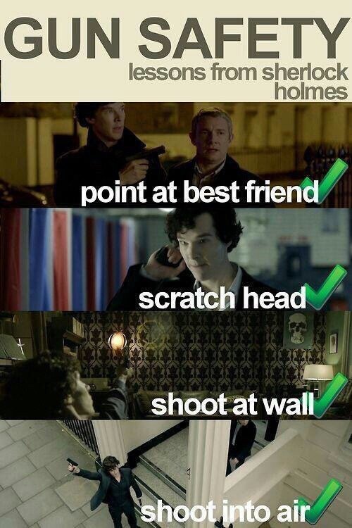 мориарти жив? (21.06.2019): Уроки «безопасного» использования питсолета от Шерлока 1) Направляй на лучшего друга 2) Чеши голову 3) Стреляй в стену 4) Стреляй в воздух