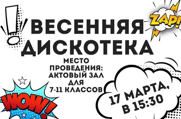 В эту пятницу, 17 марта в 15.30 11 класс устраивает школьную дискотеку! (Для 7—11 классов) Музыка с телефонов на дискотеке приниматься не будет, так что, если у вас есть предпочтения в музыке, оставляйте песни в комментариях под этим постом