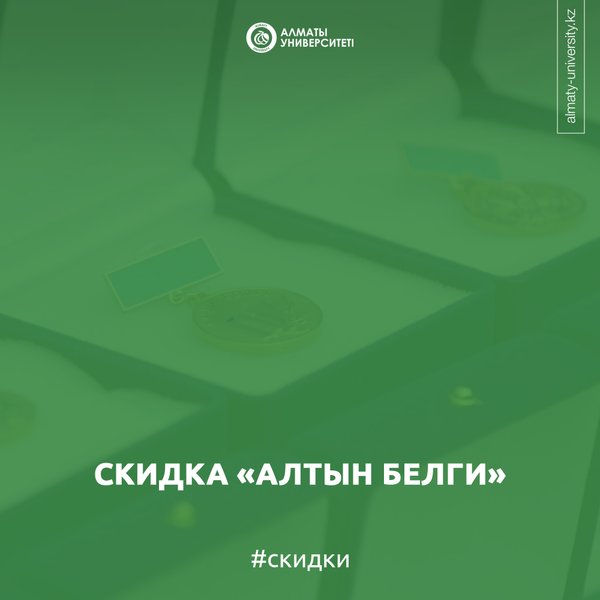 сеппен үлгерімі 3,6—3,7-ден кем емес болуы шартымен ұзартылады және университеттің студенттік өміріне белсене қатысуы есептелінеді. Скидка «Алтын Белги» Скидка предоставляется абитуриентам, поступившим на первый курс очной формы обучения (бакалавриат), имеющих документы об образовании с отличием и награжденных знаком «Алтын Бельги». Скидка представляет собой 100% от оплаты за обучение при поступлении и предоставляется на один академический период. Условием для получения данного вида скидки является обязательное внесение депозита на счет университета в размере 100% оплаты за второй курс обучения. В случае отчисления или перевода студента в другой ВУЗ депозит не возвращается. Скидка продлевается при условии, что студент учится только на «отлично» и имеет средний балл успеваемости не ниже 3,6—3,7 и принимает активное участие в студенческой жизни Университета.