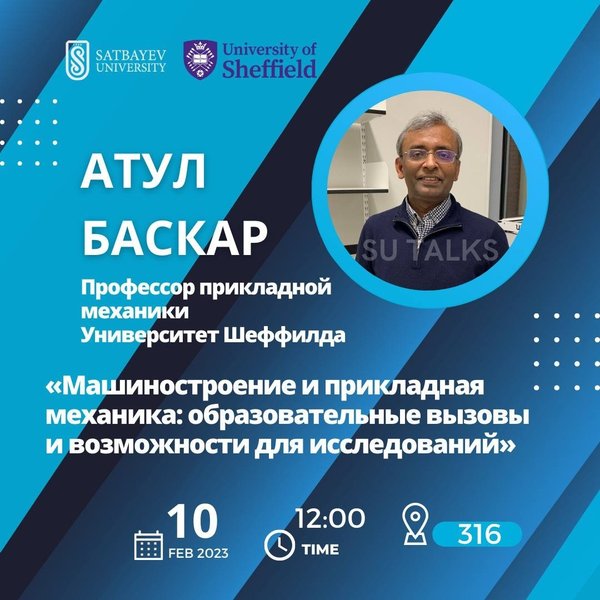 ️ ️ ️ ️ Satbayev University приглашает всех на гостевую лекцию профессора Атул Баскар из топового университета Великобритании — University of Sheffield. 10 февраля 12:00 каб. 316 University of Sheffield — один из ведущих вузов мира, один из лидеров в области подготовки технических