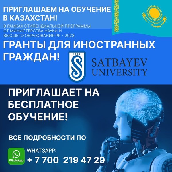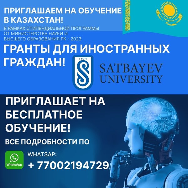 Satbayev University приглашает на бесплатное обучение в Казахстан! В рамках стипендиальной программы от Министерства науки и высшего образования РК – 2023 Гранты для иностранных граждан. Все подробности по WhatsApp: