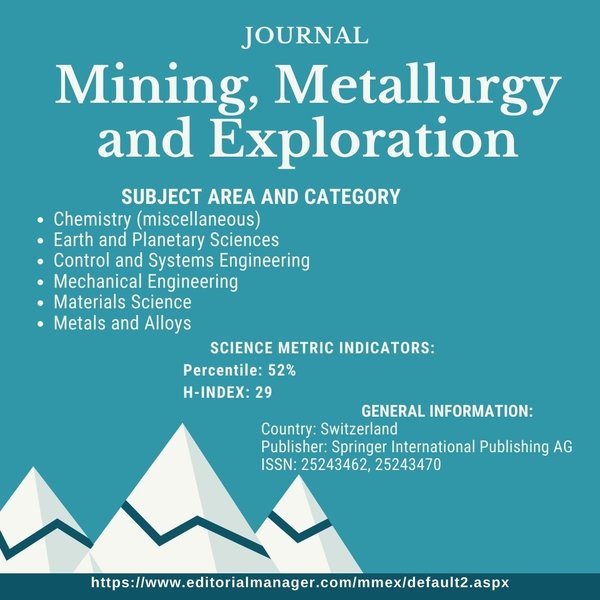 й и отраслевых методологий. *Предметная область и категория: Химия (разное); Науки о Земле и планетах; Инженерно-геологическое проектирование и инженерная геология; Инженерное искусство; Управление и проектирование систем; Машиностроение; Материаловедение; Химия материалов; Металлы и сплавы. *Сайт журнала: ️*Mining, Metallurgy and Exploration *Тау - кен, металлургия және барлау қоғамының (SME) осы халықаралық рецензияланатын журналының мақсаты — пайдалы қазбаларды өндіруге, пайдалы қазбаларды өңдеуге, металлургияға, барлауға және басқа салаларға қатысты академиялар, үкімет және өнеркәсіп туралы нақты және теориялық білімдермен алмасу үшін кең форумды қамтамасыз ету. ️ Журнал жоғары сапалы түпнұсқа зерттеу басылымдарын, тереңдетілген арнайы шолу мақалаларын, заманауи және инновациялық технологиялар мен салалық әдістемелерге шолуларды жариялайды. *Қарастырылып отырған тақырыптар: Химия (әр түрлі); Жер және планета туралы ғылымдар; Инженерлік-геологиялық жобалау және инженерлік геология; Инженерлік өнер; Жүйелерді басқару және жобалау; Машина жасау; Материалтану; Материалдар химиясы; ️Металдар мен қорытпалар. *Журналдың сайты:
