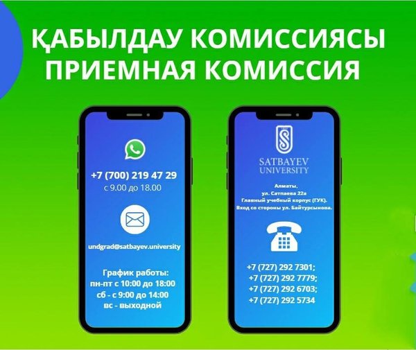 А также, ждём Вас по адресу: Республика Казахстан, г. Алматы, ул. Сатпаева 22а Главный учебный корпус (ГУК). Вход со стороны ул. Байтурсынова. undgrad@satbayev.university График работы: пн-пт с 10:00 до 18:00 сб — с 9:00 до 14:00 вс — выходной