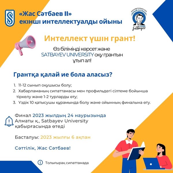 үндер: -06.02.2023—01.03.2023 жж 1-ші және 2-ші турларды өткізу (онлайн); -24.03.2023 ж.-3-турды (офлайн) өткізу (финал-10 адам). Бағыты: математика, физика, химия. Анықтама телефондары:, E-mail: smu@satbayev.university ️ ️ ️ ️ ️ ️ ️ ️ ️ ️ ️ ️ Грант за интеллект! Покажи свои знания в интеллектуальной игре «Юный Сатбаев II» и получи грант на обучение в первом техническом ВУЗе! Уже второй год Satbayev University проводит интеллектуальную игру, где школьники Республики Казахстан имеют шанс выиграть грант на обучение. Три простых шага для получения гранта Satbayev University: 1. Быть учеником 11-12-ых классов; 2. Зарегистрироваться и пройти 1—2 туры по ссылке () в описании и шапке профиля; 3. Попасть в ТОП-10 участников и пройти в финал игры. Важные даты: – 06.02.2023—01.03.2023 гг. проведение 1-го и 2-го туров (онлайн); – 24.03.2023 г. – проведение 3-го тура (оффлайн) (финал-10 человек). Направление игры: математика, физика, химия Телефоны для справок:, Е-mail: smu@satbayev.university
