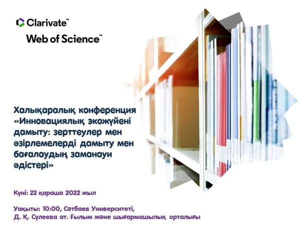 Clarivate Analytics компаниясы Satbayev University-де халықаралық конференция өткізеді Барлық мүдделі ғалымдар мен оқытушылар шақырылады! конференцияның негізгі мақсаты технологияларды коммерцияландыру призмасы және ғылыми-техникалық қызмет нәтижелері арқылы отандық ғылымның, білім мен инновациялардың қолайлы экожүйесін қалыптастыру перспективаларын талқылау болып табылады. Сондай-ақ, ғылыми зерттеулер, технологиялық әзірлемелер және білім беру саласындағы әдістер мен бағалау мәселелері қаралатын болады. Спикерлер: • Valentin Grigorievich Bogorov – Head of R&D in CIS countries, Clarivete • Mark Anatolievich Akoev — Head of Laboratory of Scimetrics, Ural Federal University • Kendrick D.White – Advisor to the Rector, Almaty Management University • Artem Leonidovich Kozlovskiy – Leading Researcher, Scientific Projects Manager • Jonathan Adams – Chief Scientist, Institute for Scientific Information, Clarivate Ауқымды іс-шараның бір бөлігі болыңыз. ️ Конференцияға қатысу үшін онлайн-нысанда тіркелу қажет: Күні: 22 қараша 2022 ж Өтетін орны: Д. К. Сүлеев атындағы :Ғылым және шығармашылық орталығы, ТМҒ