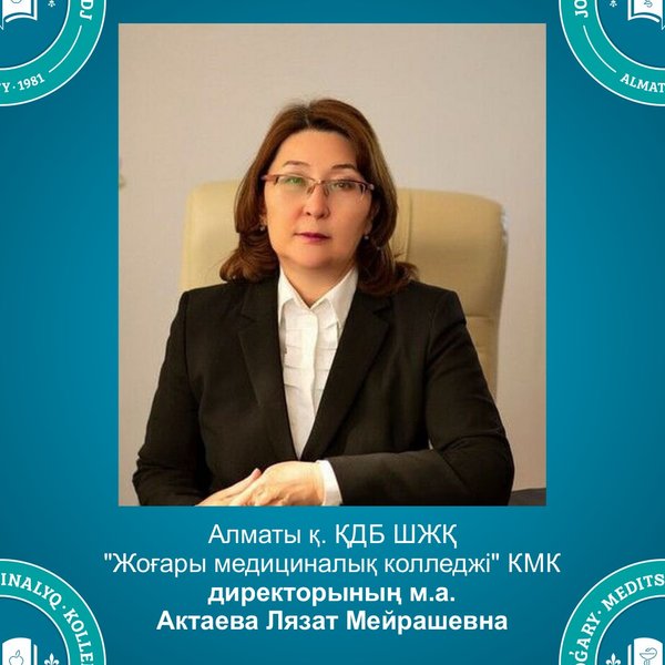 биік жетістіктер тілейміз. Сіздердiң қалалық, республикалық, халықаралық байқаулар мен олимпиадалардағы марапаттарыңыз бен жеңістеріңіз бүкіл Колледж үшін мақтаныш болып табылады! Сонымен қатар, оқытушылар құрамы мен колледж қызметкерлерін шын жүректен құттықтаймын! Баршаңызға шексіз шабыт, ең батыл жобаларды жүзеге асыру үшін күш-жігер мен мықты денсаулық тілеймін! Сіздің күнделікті еңбегіңіз бен жоғары кәсіпқойлығыңыз - білім сапасының кепілі! Алибекова Ляззат Джаныбековна — Алматы қ. ҚДСБ ШЖҚ «Жоғары медициналық колледжі» КМК директорының м.а. Поздравление с Днем знаний! В первую очередь мы поздравляем наших первокурсников! Выбрав учебное заведение с 40 летней историей, вы заложили первый кирпичик в фундамент своего будущего. У нас вы обретете новых друзей и опытных наставников. Вас ждет интересный путь становления специалиста-профессионала. Желаем вам успехов в новой самостоятельной жизни! Студентам старших курсов желаем дальнейших достижений в учебе, науке и общественной жизни. Ваши победы в городских, республиканских конкурсах и олимпиадах — предмет гордости всего колледжа! От всей души поздравляю преподавательский состав и сотрудников! Желаю непрекращающегося вдохновения, реализации самых смелых проектов, сил и крепкого здоровья! Ваш каждодневный труд и высокий профессионализм — залог качества образования! Алибекова Ляззат Джаныбековна — и.о. директора КГП на ПХВ «Высший медицинский колледж» УОЗ г.Алматы.